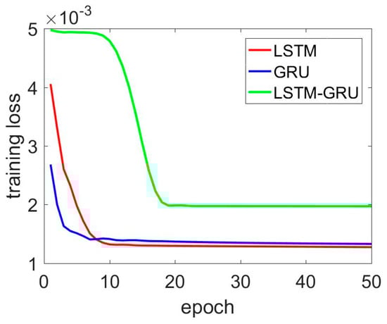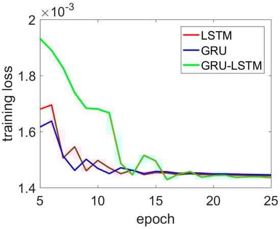 In addition, Figure 9, Figure 10, Figure 11 and Figure 12 present the detailed training losses during the training procedure. In these figures, the red line represents the training loss of the LSTM, the blue line shows the GRU results, and the last green line shows the LSTM–GRU training loss. Specifically, in Figure 9, the two-layer GRU and two-layer LSTM had better performance than the LSTM–GRU. For the LSTM–GRU, the training loss remained almost unchanging, and it converged quickly from the 10th to the 20th training epoch. In Figure 10, the LSTM–GRU outperformed the LSTM and GRU. Figure 11 and Figure 12 show the z axis gyroscope de-noised results. Figure 12 shows a magnified picture of the results from the 5th to the 20th epoch.