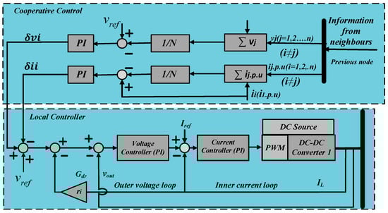 In order to enhance the proportional load sharing and DC voltage regulation, the average current and average voltage PI controllers are employed. In this cooperative controller, two correction items are generated, namely, δvi and δii for the node i. These correction terms are further input to PI controller to update the voltage reference of the local controller. The voltage and current correction items can be written as follows: