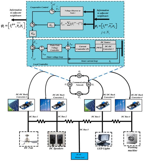 Two control objectives have been reported in literature for the secondary/primary control of DC microgrids: (i) proportional load sharing, so that power can be fairly dispatched from distributed generations to distributed load and (ii) voltage regulation, so that the desired DC bus voltage can be maintained [10,11,12]. Although several control structures have been discussed in recent literature to realize the secondary/primary control objectives noted in [10,11,12], in all these control techniques, primary control objectives have been realized with conventional PI controllers in current and voltage loop of buck converter with decentralized droop control. Therefore, there is a need for an alternative approach to local controller structure with cooperative control that is capable of realizing the DC microgrid control objectives more efficiently and has better stability, which is the first motivation of this study. Furthermore, the DC microgrid control structure is usually characterized into three types: (i) centralized control, (ii) decentralized control, (iii) distributed. Traditionally, centralized control structures implement secondary and tertiary control. In centralized control, the central controller is responsible for collecting the information from all distributed nodes and AC/DC loads. In this way, the system can achieve better regulation and current sharing. However, this technique sometimes becomes impractical, especially in cases of single point of failure or when large-scale penetration exists in distributed generations [13,14]. The implementation of the centralized control technique is also very expensive, requiring a large communication structure with adequate bandwidth to exchange information quickly and precisely [15]. In order to improve microgrid robustness, expandability, and reliability and reduce the capital cost, it is highly recommended that distributed control structures are adopted. The aim of such a controller is to have the ability to fulfill the requirements of DC microgrid control objectives. A distributed control structure requires the support of a communication network [11,13,16]. While support of a communication network aims to improve system reliability and expandability, unfortunately, communication network limitations, such as communication delay, may affect or even degrade the system performance, stability, and reliability of consensus-based distributed cooperative control [17,18]. Therefore, while designing a consensus-based distributed cooperative control structure, it is imperative to consider the communication delay effect on the stability of a DC microgrid; this is the second motivation of this study.