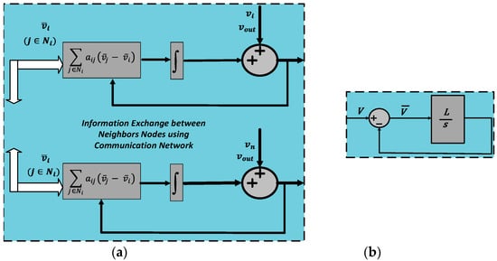 Figure 4a shows the global averaging policy for each node of the distributed cooperative control. To estimate the average voltage difference in cooperative control, the observer uses the estimated value of the local node and processes the information of the neighbor’s estimates. The observer at node obtains information from its neighbor’s estimates . After this, the voltage observer upgrades its personal estimate using the adjacent neighbor’s estimates and measurement of the local node which can be written as follows [11]: