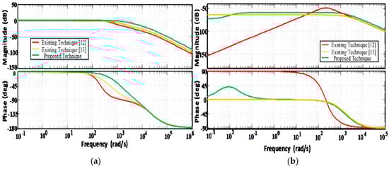 The local controller is based on the inner and outer loop control. Droop control is part of the local controller, as shown in Figure 6a. The proposed local controller is much simpler, due to the implementation of P controller in the current control loop, as an alternative to PI, and finite-gain controller in the voltage loop. The finite-gain controller has better gain margin than PI, and due to the P controller, the relative degree of control is reduced, and the system has lower transient time and oscillations. This small signal analysis is used to evaluate the stability behavior by considering the frequency response of and . Here, represents the disturbance current that is applied at output. By considering the small signal model, the root loci of for both the recent techniques [12,13] and the proposed technique with the increasing value of kp are noticed, and appropriate values are selected. The bode plot response of and are represented in Figure 7a,b, respectively. From Figure 7a, it can be observed that the phase and magnitude performance of the proposed technique is superior compared to the existing conventional techniques [12,13]. Therefore, the proposed droop-less local controller has better stability compared to the existing techniques. On the other hand, with the disturbance current the magnitude response of the proposed controller is superior to the existing techniques, while the phase performance of the existing controller [13] is slightly better than the proposed technique, as shown in Figure 7b. If the gain of the controller tends to increase in the outer voltage loop, then it will improve the steady state error, and the overshoot of the system also increases. Therefore, the stability of the proposed system would be reduced, but the system will achieve better current sharing. The inner current loop of the local controller reduces the effect of component variation by linearization and by shifting the system poles toward the negative real axis. However, due to the measurements of voltage and current not being precise enough, parameter variations can still exist. Therefore, the local controller of the control structure has inadequate accuracy; this difference in accuracy is averaged out by distributed cooperative control.