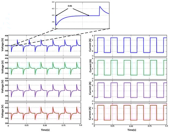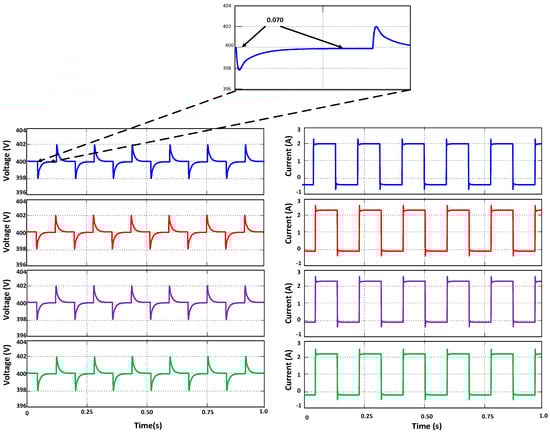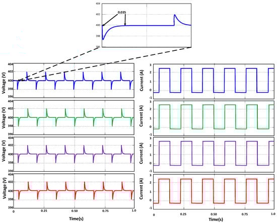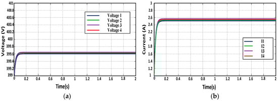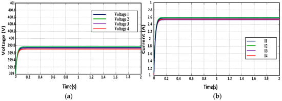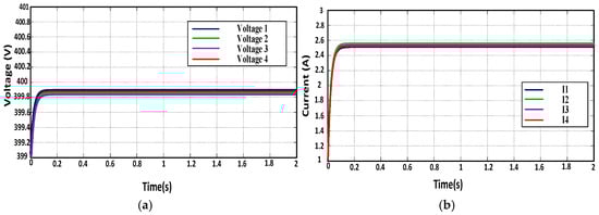 The response of voltage restoration and current sharing of the two existing techniques are shown in Figure 12 and Figure 13, while that for the proposed technique is shown in Figure 14. The convergence time of the conventional droop-control-based technique [12] was 0.07 s, while the convergence time of the other technique [13] was 0.06 s. The disturbance response for the proposed technique is depicted in Figure 14. The convergence time of the proposed technique was 0.035 s which was 50% less than the conventional droop-based controller, while the other controller time was almost 85% of the droop-based technique. In the presence of disturbance, the proposed technique converged to its reference level in very little time, which showed that the finite-gain controller facilitated faster convergence and better robustness to disturbance. Due to the disturbance effect, the current-sharing accuracy of the conventional droop-based controller was affected, while the proposed controller current sharing was better. It was found that the proposed controller response on disturbance was much better than the both recent existing techniques, and the DC microgrid control objectives could be achieved more efficiently with better system stability. Hence, the simulation results confirmed the remarkable performance and superiority of the proposed controller.