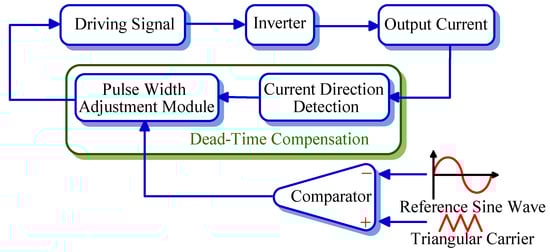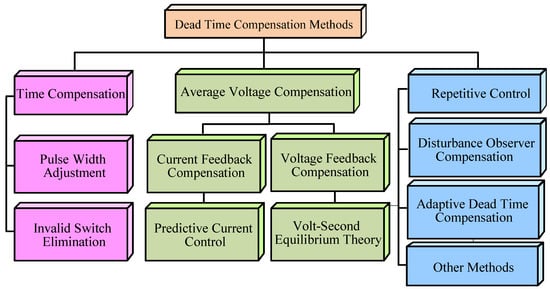 Figure 1. In general, dead-time compensation methods are divided into three methods: time compensation method; average voltage compensation method; and other methods, which use existing mature modulation technologies. Among these, the time compensation method is most widely used, with other methods using closed loop control.