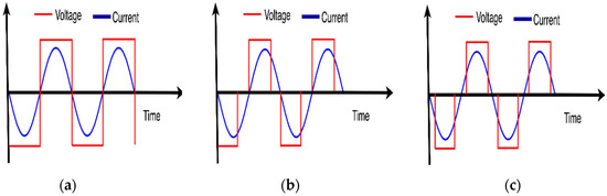 Although the efficiency of the SRC is high around full load conditions, it deteriorates at light loads for which the switching frequency needs to be increased above the resonance frequency, increasing the switching losses. Many methods have been proposed to achieve higher efficiency at low load conditions [7,8]. However, all these methods suffer from a similar problem: losing the soft switching property at turn-on, or at turn-off, or both, nullifies the advantages of soft switching. These cases are illustrated in Figure 2. When the converter operates at full load (Figure 2a) voltage transitions and current transitions occur at the same time leading to soft switching. When the converter operates at partial load, the turn-on may use zero-current switching but turn-off may use hard switching as shown in Figure 2b, or both turn-on and turn-off may use hard switching as shown in Figure 2c.