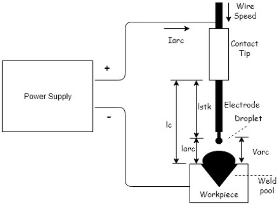 The welding machine for GMAW includes a DC power source. The positive terminal of this power source is connected to the welding electrode while the negative one is connected to the workpiece or vice versa. At the steady state when the arc current and the arc length ( are positive, the arc voltage () and arc power functions that generate arc energy for making a metal joint can be expressed as follows [3,12,13,14]: