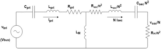 is the turns ratio of the transformer, is the primary coil AC resistance, and is the secondary coil AC resistance. and are assumed in this analysis. and are the compensation capacitances that determine the resonant frequency by compensating for the leakage inductance. All parameters on the secondary side of the transformer are reflected in the primary. The analysis of the SRC can be performed using this equivalent circuit [16].