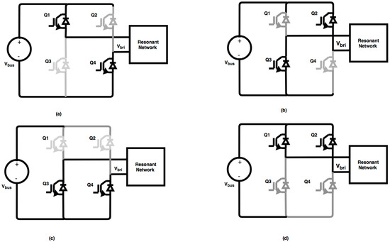 As shown in Figure 7, the H-bridge inverter has three modes of operation: it generates positive voltage () when Q1 and Q4 are on, negative voltage () when Q2 and Q3 are on, and zero voltage () when either Q1 and Q3 or Q2 and Q4 pairs are on. The last two modes can be called the circulation modes. The first two modes are initiated when diagonal switches are turned on creating a resonant pulse train. At the end of the first pulses these modes end, and circulation modes start. In circulation modes pulses continue to flow through the load [18].