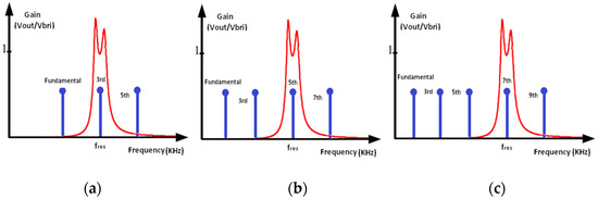 The power control in this circuit is achieved by changing the switching frequency of the SRC in such a way that it is equal to , , etc. If the required power is low, the switching frequency is adjusted to a lower value so that a very high order of harmonic is at the resonant frequency. In this case, the value of the voltage harmonic at the resonance frequency is low, generating low power. For full power, the highest possible switching frequency () is selected. In this case, the third harmonic of the voltage determines the power. This concept is depicted in Figure 9 for a system using three different switching frequencies for three specific power levels. Figure 9a shows the case for the highest power for which the switching frequency is equal to 1/3rd of the resonant frequency. In Figure 9b, a lower power is required and switching at 1/5th of the resonant frequency produces a 5th harmonic voltage whose RMS value is 1/5th of that of the fundamental. Figure 9c shows the case when the power demand is the lowest. Switching at 1/7th of the resonant frequency produces a 7th harmonic voltage whose RMS value is 1/7th of that of the fundamental.