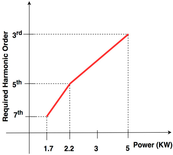 The system has been designed to have the harmonic order–power profile as shown in Figure 12. For full power the third harmonics (5 kW), for medium power (2.2 kW) the fifth harmonics, and for low power (1.7 kW) the seventh harmonics are used.