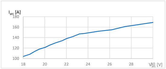 The arc current–arc voltage relationship has been obtained for these parameters as shown in Figure 11. As seen in the graph the variation is linear in the designed operation range.