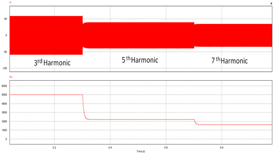 Harmonic order–power relationship for the designed system: Primary current (upper trace), load power (lower trace).