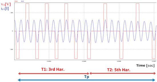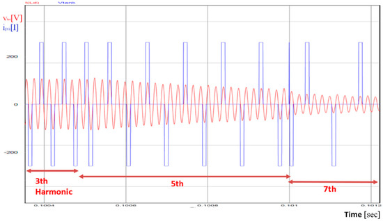 Figure 8 shows the output voltage waveforms of the H-bridge () and its harmonic components. D is the duty cycle defined as the ratio of the on time switches to the half period (D). The phase shift between the two legs controls the RMS output voltage of . Fourier series expansion of this voltage is given as [1]: