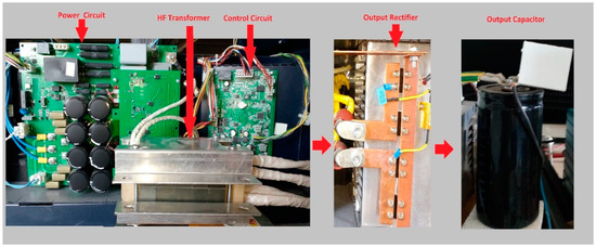 The designed system has been built and tested. The experimental 5 kW set-up is shown in Figure 15. DSPIC33EP128GS806 has been used as the core of the control circuit. The full-bridge is composed of four IGBTs (Semikron SKM200GB125D) that work with the resonant converter up to 100 kHz, and a Ferroxcube E80/38/20 (3C94) ferrite core for high frequency transformers and the two resonant inductors.
