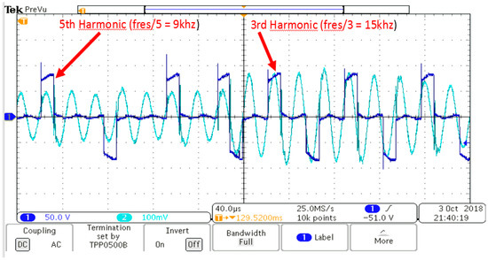 Third and 5th current harmonics signals at 60% load (Ch.1: voltage () and Ch.2: current ()).