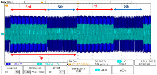 Figure 18 shows the output voltage of the bridge and primary resonant current waveforms at 60% load. Waveforms have the 3rd and 5th harmonics as expected. The power is estimated by the feedback of the current and voltage and the required percentages of each harmonic (switching frequency) for one full period () is determined by using the look-up table.