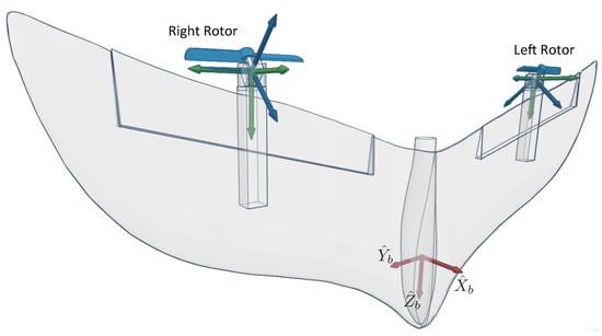 Denoting by and the thrust magnitudes of right and left rotors, respectively; the definition of the thrust forces in body axis is characterised by the angles and of the right and left motor frames with respect to the body frame.