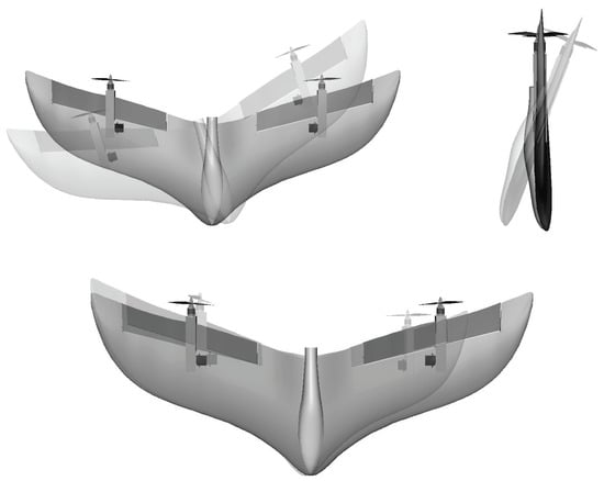 Figure 2 shows an outline drawing of the V-Skye. In order to simplify the dynamics, all actuation parts (motors, motor frames, servomotors and their transmission parts) are allocated as symmetrically as possible about the fixed coordinate axis of the aircraft reference frame. In particular, all elements are placed on the plane and symmetrical to the plane.