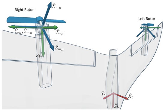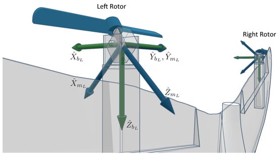 Because the right motor frame is attached to the main body by a rotatory joint, it has one single DOF: the angle rotated about the axis . When , both and have the exact same position and orientation. The direction of the right motor’s thrust is changed by actuating on the value, since the thrust has always the direction. For this reason, a servomotor is used to manipulate .