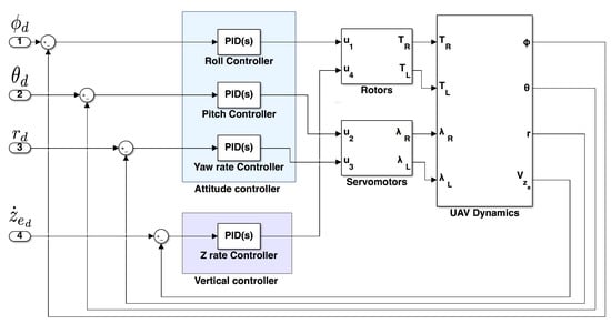 Due to their simplicity, ease of implementation and robust performance, a decentralised and linear control scheme based on four proportional-integral-derivative controllers (PID) has been chosen to design the attitude tracking controller. Figure 6 shows the block diagram of the proposed feedback control scheme. It is composed by a controller for each angle of orientation and one for the vertical velocity.
