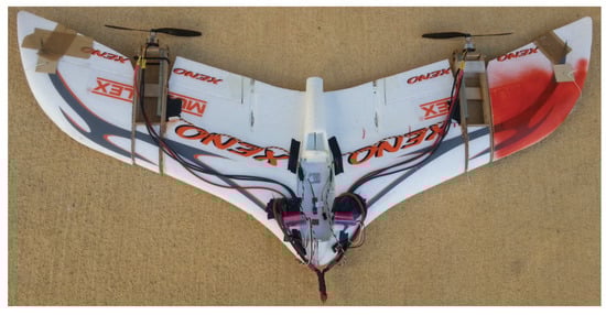The initial test platform presented in the work is a Flying-wing from Multiplex, model XENO UNI [26]. This RC plane has been modified to add two tilt rotors, following the main concept of VTOL UAV described previously. Figure 7 and Figure 8 show the prototype assembled for real flight tests.