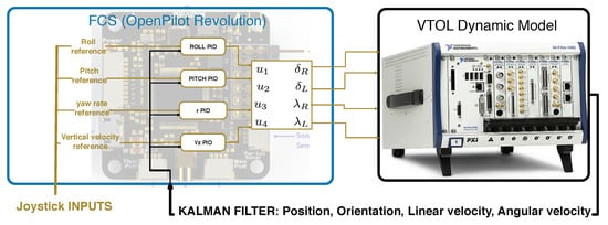 A CC3D OpenPilot Revolution Board [36] has been elected as the flight control unit (FCS). It is a digital board with a micro-controller that comes with the necessary onboard sensors and autopilot software already installed. The control algorithms have been modified and implemented on the FCS. Then the onboard sensors have been bypassed so that the values coming from the model are used to close the loop. Finally, the board has been connected to the PXI to send actuators values and receive state variables values. A joystick has also been connected to the board to send the reference value to the controllers.