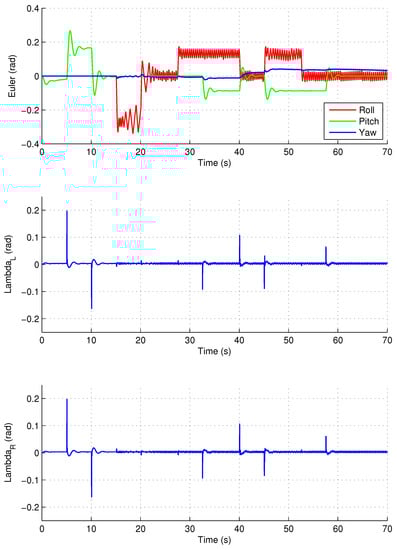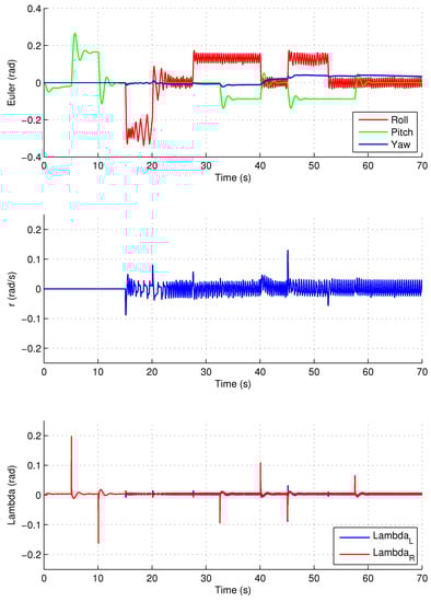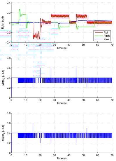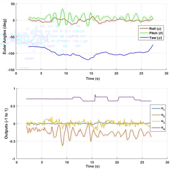 The experimental results for the platform control are presented in Figure 14 as a time plot of all angles of the UAV and the controller actions.
