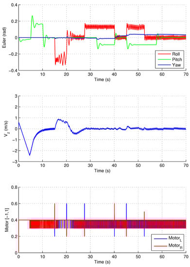 Figure 13 illustrates that each pitch or roll angle apart from the equilibrium ( or ) implies an increase in , which is compensated by an increase in the thrust generated by the rotors. Again, since the controlled variable is the vertical velocity, each time a perturbation occurs there is a loss of altitude that is never recovered, but the vertical speed controller manages to stop falling and reaches again the set-point.