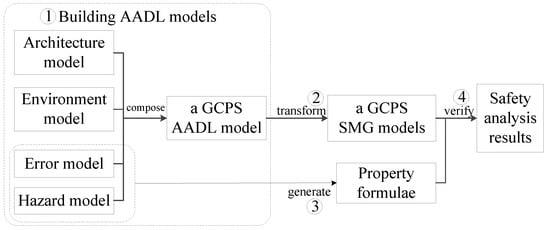 The proposed safety analysis framework for GCPSs is presented in Figure 1 including four steps. Firstly, the specification of a GCPS is described using AADL, and safety requirements related to errors and hazards are specified using EMA and HMA with randomization and nondeterminism. Secondly, the proposed approach will integrate the probabilistic model-checking of SMGs with safety analysis. Thus, transforming AADL models to PRISM-games models is required to obtain SMG models for our model-based analysis approach. Thirdly, according to error models and hazard models, property formulae of a GCPS should be generated for checking whether safety requirements are satisfied by the system model. At last, we can verify property formulae for a GCPS and obtain safety analysis results. The detailed explanation is provided in the following four sections.
