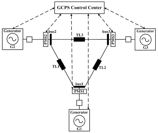 The power system is always described as a single line diagram. A modified, redrawn and relabeled IEEE 9-bus power system [24] with power management systems (PMSs) is shown in Figure 2. It is a GCPS. The bus in this figure represents a node and it is different with the bus component in AADL models. This GCPS has three buses (bus1, bus2 and bus3), which are managed by PMSs (PMS1, PMS2 and PMS3), respectively. A PMS contains some hardware devices such as sensors and line breakers, etc. It can sample data, receive commands from the control center, and control line breakers. Here, a PMS is considered as a whole and the internal structure is not specified at the architecture level. In this GCPS, there are three generators (G1, G2 and G3) used to supply the power. Black lines between buses and generators are power transmission lines (TL1, TL2 and TL3). Additionally, there exists a control center system to control this GCPS. PMSs and generators can send and receive the information to the control center.