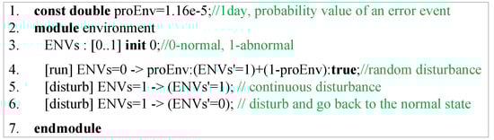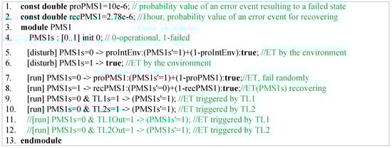 The error transition from abnormal to abnormal or from abnormal to normal in the environment of Figure 3 is the occurrence of interference. It will disturb GCPSsys through error propagations and event port connections. For example, an error propagation from abnormal state of environment component to PMS1 is encoded as an action disturb based on Definition 11. Based on the second and third rules of Definition 10, this action is added to commands at lines 5 and 6 of Figure 7 and lines 5–6 of Figure 5. These commands are transformed from ETs. Moreover, since error transitions of GCPSsys are not caused by the environment, a command at line 11 of Figure 8 is added for the synchronization between modules.