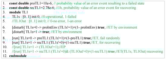 If is not related to the environment, it is transformed according to the first rule of Definition 12. For example, if an error propagation from T1F to PMS1 in TL1 of Figure 3 is transformed according to in Definition 10, error transitions in TL1 are transformed to commands at lines 8–9 of Figure 6, and error propagations in PMS1 are transformed to commands at lines 7–10 of Figure 5. If that error propagation from T1F to PMS1 in TL1 is transformed according to in Definition 10, error transitions of TL1 are transformed to commands at lines 8 and 11 of Figure 6, and error transitions of PMS1 are transformed to lines 7–8 and 11–12 of Figure 5. The command at line 11 of Figure 6 is corresponding to the recovered error transition, so it also should recover the variable for an outgoing propagation point in the transition of this command.
