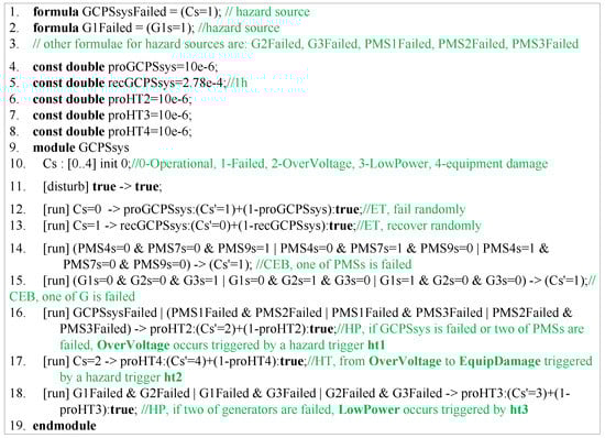 Each failed state of PMSs, generators and GCPSsys system is a hazard source. These hazard sources are encoded as formulae at lines 1–3 of Figure 8. These hazard sources can lead to hazards through HPs. When two of PMSs fail or GCPSsys system state fails, the dangerous overvoltage may occur as a hazard (OverVoltage) triggered by a hazard trigger ht1. OverVoltage will lead to a hazard EquipDamage (equipment damage) triggered by a hazard trigger ht2. When two of generators fail, the power is not enough for users and may affect the normal production process as a hazard (LowPower) triggered by a hazard trigger ht3. Assuming that occurrence probabilities of hazard triggers is . According to model transformation rules in Definition 16, two HBs are encoded as two commands at lines 16 and 18 of Figure 8. A HT is encoded as a command at line 17.