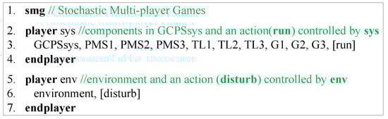 Based on transformation rules in Section 4.2, a GCPS AADL model is transformed to a complete SMG model. Two players of this SMG model are shown in Figure 9. The environment component is encoded as the environment module, which is regarded as a player env, as shown at lines 5–7. Other modules are composed as a player sys, as shown at lines 2–4. The action disturb is controlled by the environment, so it is contained in the env player. The action run is contained in the sys player.