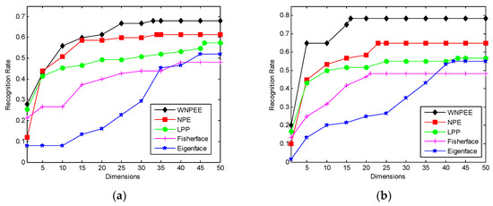 The recognition rate corresponds to reduce dimensions for different DR algorithms are shown in Figure 4a–d for different values of . It is observed from graphs that mostly all comparable methods achieves their peak values of recognition rates in between dimensions 15 to 20 and then becomes stable for higher dimensions. We can also deduce that WNPEE shows the best results whereas NPE overcomes the other three graph-based DR methods.
