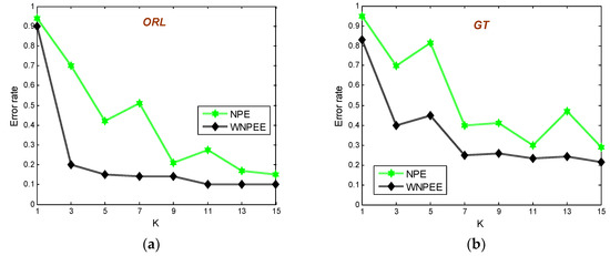 As mentioned before the NPE is among the best graph-based DR methods, but still its performance is very sensitive to the neighborhood size parameter. Thus, to overcome this sensitivity problem in classical NPE we proposed a new WNPEE DR technique. To evaluate the WNPEE sensitivity to the neighborhood size parameter we have conduct experiments on four face databases ORL, GT, CMU PIE, and Yale. The experimental results are observed in form of error rates with varying the parameter of neighborhood size. In these experiments, we vary the value of parameter k from 1 to 15 with a step size of one and plot the corresponding average error rates, as shown in Figure 9. Figure 8a–d are for ORL, GT, CMU PIE, and Yale databases, respectively.