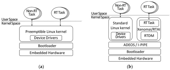 Classification of real-time embedded Linux systems: (a) fully preemptible kernel approach; (b) dual-kernel approach.