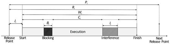 In this equation, Ii denotes the sum of the computation time of all the elements included in the set of tasks with higher priority than task τi, hp(i). If ∃τhp(i), Equation (1) is iterated x number of times until . The test should be stopped once the current iteration yields a value of beyond the deadline else, it would be impossible to terminate. This is only applicable to determine the busy period of the current task, τi, and should be repeated when needed for the other tasks. After the busy period is calculated, the overall response time of the system is determined by the following equation [8]: