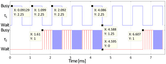 Execution timeline of the real-time tasks for the experiment with two tasks. The blue solid line represents the higher priority task, τ1, and the red solid line represents τ2.