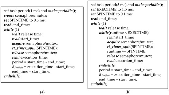 Pseudo code for measuring the response time of real-time tasks with mutex and semaphore: (a) high priority task, τ1; (b) low priority task, τ2. Note that the same pseudo code can be applied in the periodicity and response time test (previous section) but omitting the mutex/semaphore operations.