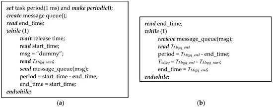 Pseudo code for measuring the elapse time of a message queue between two tasks: (a) high priority task (sender); (b) low priority task (receiver).