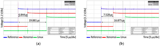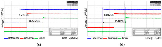 Comparison of interrupt response times of Xenomai and the standard Linux on different OES: (a) BeagleBone Black; (b) Raspberry Pi 3 (c) Zybo-7020; (d) i.MX6Q SABRELite.