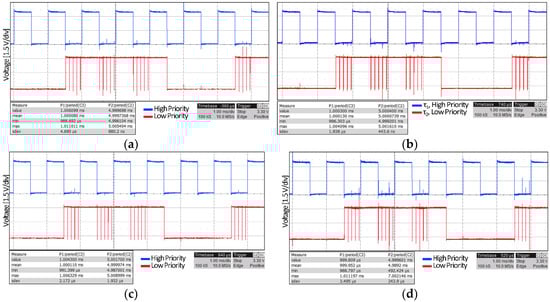 Let us again consider the two-task application described in Figure 4, the output GPIO is toggled to visualize the jobs. Figure 7 shows the actual behavior of the tasks observed using an oscilloscope for all the designed real-time controllers. The high priority task (τ1) runs periodically with an average of 1 ms for all the embedded controllers. The lower priority task (τ2) at the bottom part of the plot also maintains periodicity running with an average of 5 ms. This shows that the minimal interrupt response time produced by the RTDM driver does not affect the periodicity of the real-time tasks. As expected, Raspberry Pi 3 shows the best performance with standard deviation of 1.938 μs and 443.6 ns for τ1 and τ2, respectively.