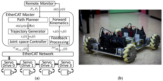 EtherCAT-based omnidirectional mobile robot: (a) Control architecture; (b) Actual image of the mobile robot.