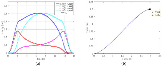 To demonstrate the validity of the system, a path planning method in Reference [10], was implemented to generate a path from (0 m, 0 m) to (3 m, 1.5 m). The convolution-based trajectory generator produces central velocity commands that can track the planned path as shown in the black solid line in Figure 9a. This is decomposed into the joint space velocities through the joint space controller. The joint space velocities vi (I = 0,1,2,3) are the actual velocities sent to the actuators. The feedback from the encoders are acquired and are analyzed to show the actual position of robot as shown in Figure 9b. The results show that the mobile robot was able to accurately track the desired path with minimal error at the end point.