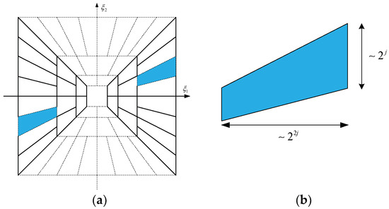 where, is associated with scale transformation and is associated with geometric transformation. In Equation (1), denotes an anisotropic matrix and denotes a shearlet matrix; at this point, the synthetic wavelet is called a shearlet and the values usually are taken as , . Figure 1 shows the frequency decomposition and supports of a shearlet. The frequency supported base of each element is a trapezoid region, the size is approximately , and the slope is .