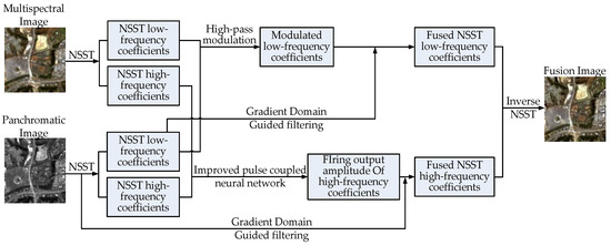 The factors affecting the fusion quality of PAN and MS images mainly include two aspects: the integration of spatial details and the preservation of spectral information. The main purpose of pansharpening is to establish a good tradeoff between the injection of spatial details and the preservation of spectral information. It is assumed that PAN and MS images that are used for fusion have been geometrically registered. NSST is utilized to decompose the source images with multi-scale and multi-direction into different frequency coefficients. The high-frequency coefficients represent the detailed features of the image, which is the reflection of spatial information. The selection of high-frequency coefficients plays an important role in the maintenance of detailed spatial information and improving the spatial resolution of the fused image. The low-frequency coefficient image is the approximate version of the original image, which contains the most energy and spectral information. The selection of low-frequency coefficients is of great importance for maintaining the spectral signatures and reducing the spectral distortion of the fused result. According to the different significant features that need to be preserved in different frequency domains, the corresponding fusion rules of high- and low-frequency coefficients are proposed. Figure 4 illustrates the flowchart of the multi-scale image fusion procedure that is based on NSST, and the fusion steps are as follows: