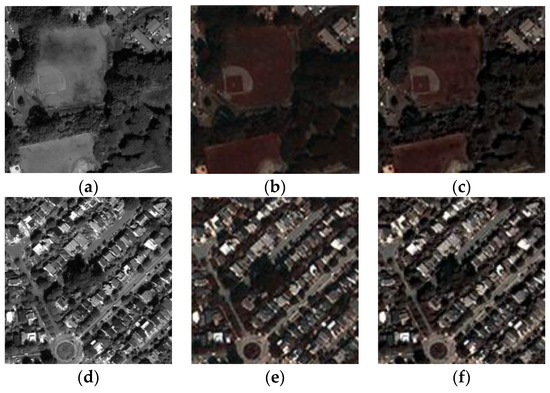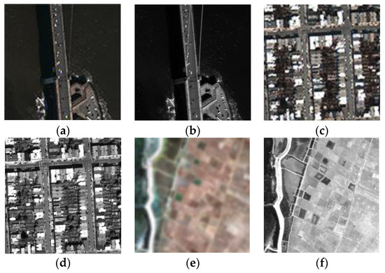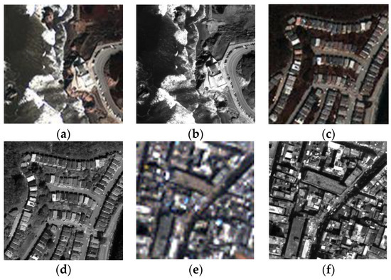 Three image pairs of experimental data sets used for assessment with reference. The first two came from the WorldView-2 satellite, and the third was collected from the QuickBird satellite: (a) test MS image 1; (b) test PAN image 1; (c) test MS image 2; (d) test PAN image 2; (e) test MS image 3; and, (f) test PAN image 3.