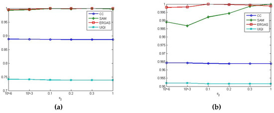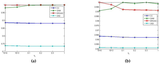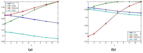 In order to operate the assessment directly on the data at the original resolution, the quality with no reference () index was proposed [45]. This index measures the correlation, luminance, and contrast between the two images. is composed of two separate indices, and , which denote the distortion of spectral and spatial features, respectively.