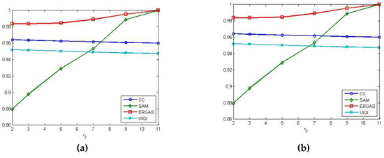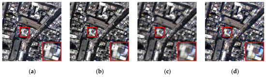 As detailed below, nine well-known indices are utilized to evaluate the spatial and spectral qualities of the fused results. The correlation coefficient () reflects the similarity of spectral features, and structural similarity () is a structural similarity index. The spectral angle mapper () is utilized to measure the spectral distortion. Root mean square error (), erreur relative global adimensionnelle de synthèse (), and the universal image quality index () measures the global quality of spectral and spatial features. The “quality with no reference” () indicator measures the overall quality of the fused image and it is composed of two separate indices, the spatial distortion index and the spectral distortion index .
