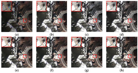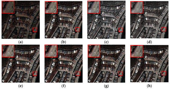 For the group 1 image pair of the WorldView-2 data set, the corresponding fused products are given in Figure 11a–h. The fusion results of IHS, NSCT-PCNN, NSST-SR, MSVD, PRACS, GSA, and MF-HG are shown in Figure 11a–g, respectively; Figure 11h is the result that is generated by our method. It can be seen that the fused image that was obtained by the proposed method achieves a satisfactory visual effect in terms of the preservation of spectral information and spatial details. When compared with the other methods, there is a severe spectral distortion in the fused image that is obtained by the IHS method. The spatial and spectral quality of fusion result of the NSCT-PCNN method is relatively good. The fused result of NSST-SR suffers from some degrees of color distortion, and from the enlarged rectangle sub-image we can see that there are not enough details of the cars. The fusion results of the MSVD and GSA methods have some blurring at the edges of the cars. The PRACS method results in some noise in the dark area next to the cars. The MF-HG method shows the quality of the spectral information preservation and the spatial details injection is enhanced.